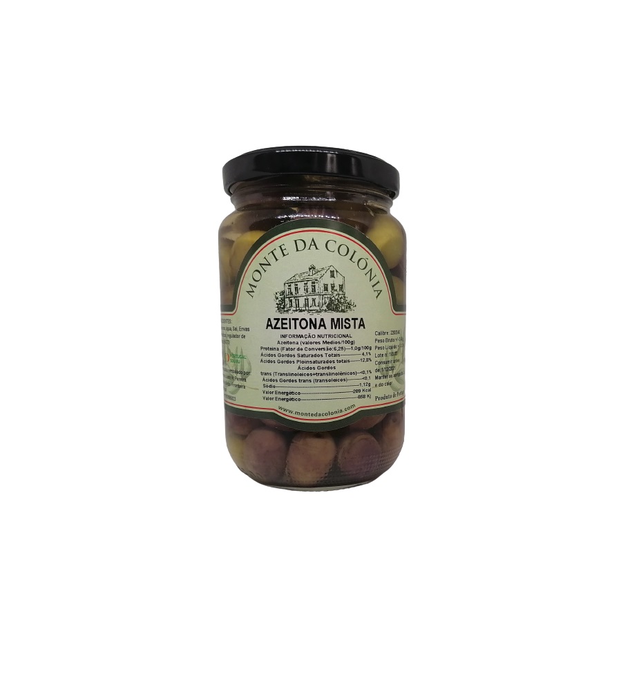 Frasco de azeitonas MISTA Monte da Colónia temperadas com orégãos.