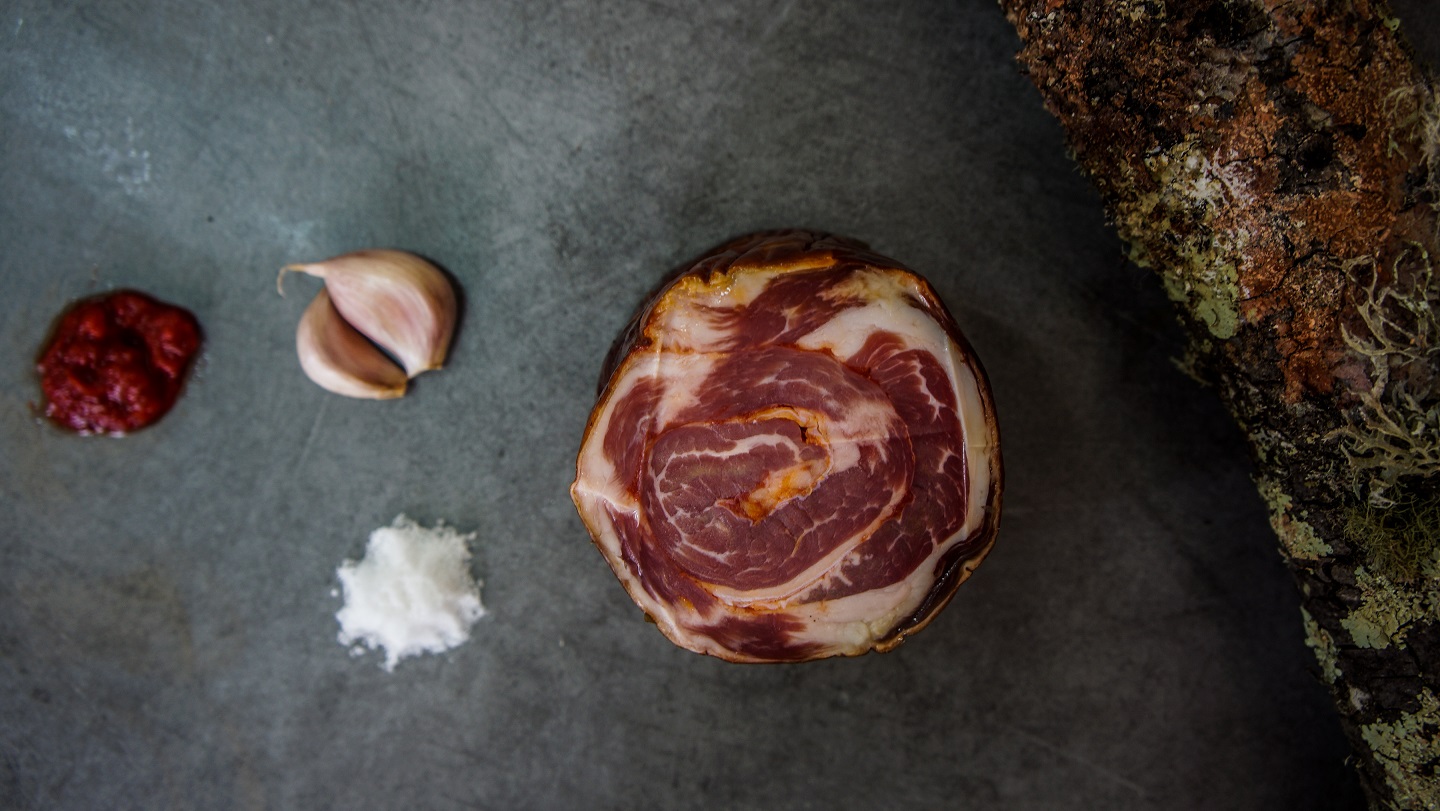 Carne de porco preto ,Água, Massa de Pimentão, Massa de Alho(Sal e Antioxidante E334); Aditivos: Proteína de SOJA e LEITE, amido, cloreto de Sódio, pimentão doce; Dextrose, Emulsionantes (E451), Antioxidantes(E301,E331), Conservantes(E250,E252)