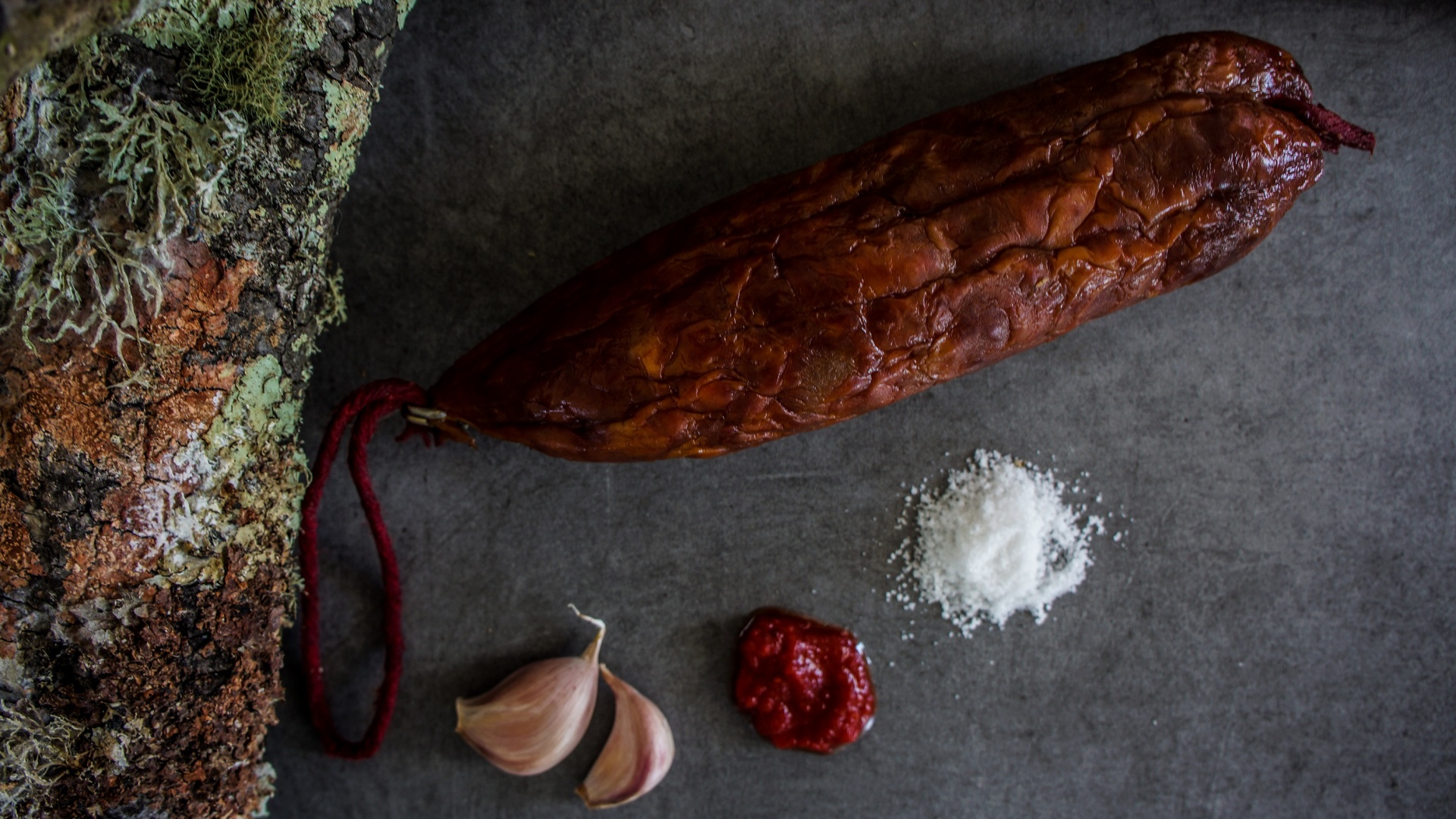 Carne magra de porco preto ,Água, Massa de Pimentão, Massa de Alho(Sal e Antioxidante E334); Aditivos: Proteína de SOJA e LEITE, amido, cloreto de Sódio, pimentão doce; Dextrose, Emulsionantes (E451), Antioxidantes(E301,E331), Conservantes(E250,E252)