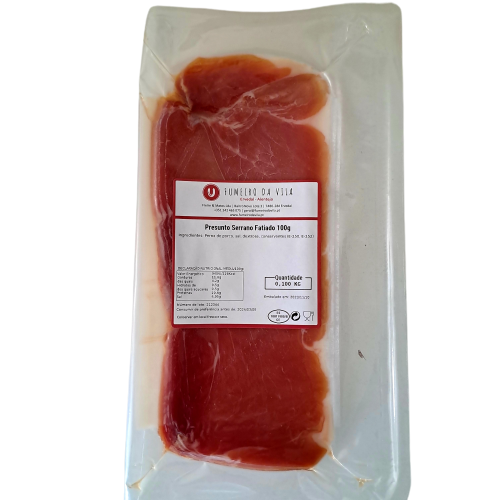 Presunto Serrano fatiado em embalagem de 100g.